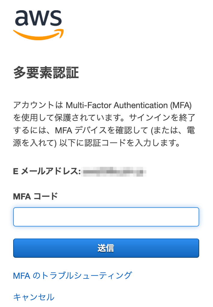 MFAでAWS(ルート)アカウントを保護している場合は、"MFA コード"欄にMFAデバイスに表示されている6桁の数値を入力します。